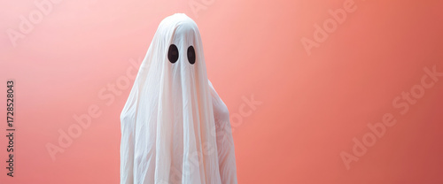 A playful ghost figure draped in a white sheet with black eye holes stands against a soft coral background, creating a whimsical atmosphere perfect for Halloween-themed decorations or events