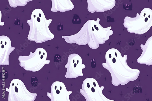 A playful pattern of various cartoon ghosts with expressive faces on a background. The ghosts have wide eyes and open mouths, evoking surprise or fright. Ideal for Halloween designs. AI-generated