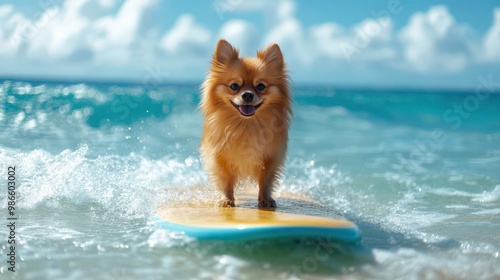 pomeranian, surfboard, beach, wave, ocean, dog, surfing, sunny, water, playful, pet, cute, standing, adventure, happiness, summer, coast, fun, training, canino, animal, sea, sport, leisure, lifestyle, nature, day, fluff, excitement, motion, puppy, crashing, riding, play, activity, furry, friends, vacation, surf, culture, blue, sky, small, friends, breeze, relaxation, weather