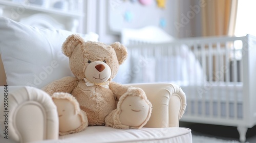 plush, teddy, bear, sitting, armchair, baby, childcare center, room, crib, white, linen, blanket, pillow, cosy, charming, adorable, setup, decor, interior, design, cute, soft, cuddly, infant, bedding, comfort, furniture, home, space, peaceful, serene, sweet, welcoming, warm, inviting, comfortable, gentle, soothing, pastel, textile, arrangement, organised, clean