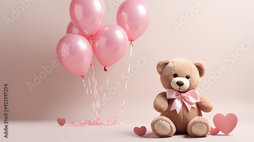 A plush teddy bear with pink balloons and gifts creates a heartwarming celebration mood.