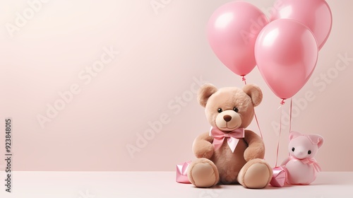 A plush teddy bear with pink balloons and gifts creates a heartwarming celebration mood.