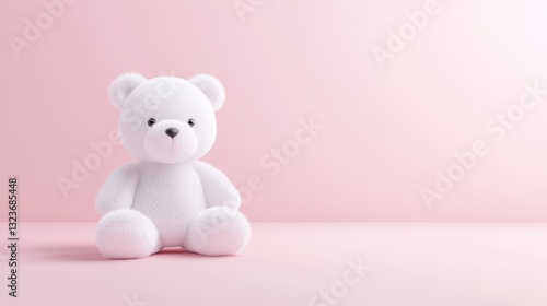 A plush white teddy bear with round ears and a gentle expression rests against a light pink background. The soft texture and simple design create a soothing atmosphere ideal for a child's room