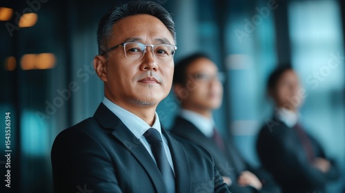 A poised businessman exudes confidence while standing in a modern office, surrounded by colleagues, symbolizing leadership, professionalism, and teamwork in a corporate setting.