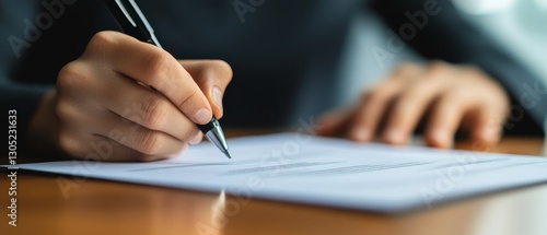 A poised hand signs a document with precision, reflecting the formality of business and the gravity of commitments made on paper.