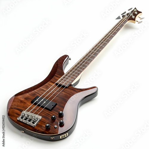A polished bass guitar with a deep body and long neck