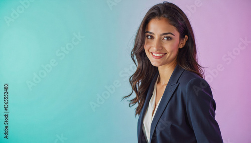 A portrait headshot photo of a friendly professional CEO executive business worker: A confident young businesswoman with long dark hair smiles warmly while wearing a navy blazer against a vibrant
