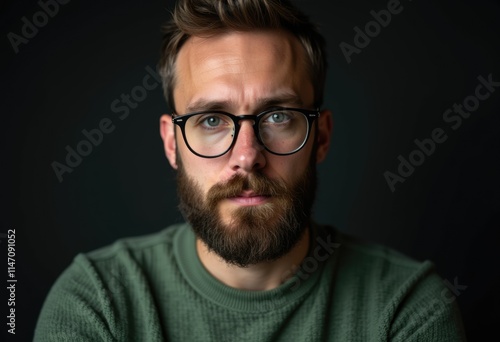 A portrait of a bearded man wearing glasses, serious expression, dark background.