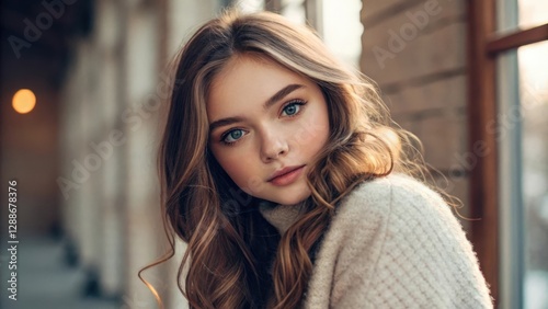 a portrait of a beautiful young woman with long wavy hair looking at the camera. She is wearing a warm sweater and has a natural and innocent expression