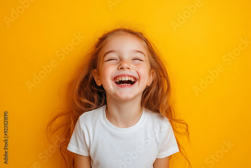 A portrait of a cheerful girl radiates joy and excitement against a bright, vivid yellow background.