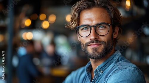 A portrait of a confident man with glasses and a beard, dressed in a casual denim shirt, posing in an indoor setting with a blurred background of warm lights