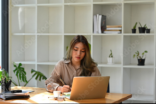 A portrait of a pretty Asian woman sitting in the office looking at a laptop and working on a document, for business and technology concept.
