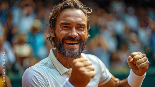 A portrait of a tennis player with a joyful expression on his face after a successful blow, where