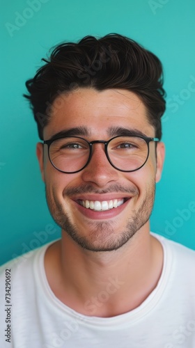 A portrait of a young man wearing glasses smiling for the camera.