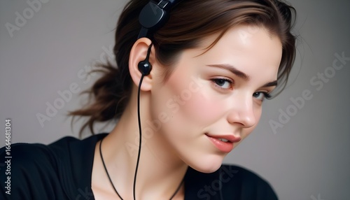 A portrait of a young woman wearing headphones, enjoying music with a soft expression and beautiful features.