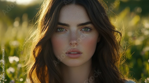 A portrait of a young woman with brown hair set amidst a field of wildflowers is bathed in the soft light of golden hour