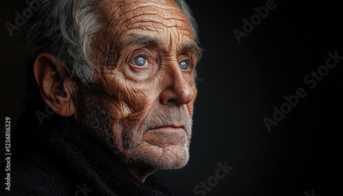 elderly, man, portrait, face, wrinkle, line, skin, aged, old, senior, grey, hair, beard, eye, blue, gaze, contemplative, thoughtful, expression, emotion, pensive, serious, sombre, weathered, textured, detail, close, up, dark, background, shadow, light, contrast, monochrome, photo, image, human, person, life, time, wisdom, life events, story