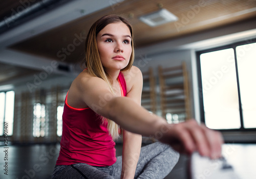 young, caucasian, beautiful, woman, girl, female, person, adult, teenage, teenage, portrait, indoor, inside, gym, sport, training, exercise, fit, fitness, doing, physical exercise, work out, lifestyle, healthy, health, active, leisure, community, center, club, hobby, recreational, pursuit, well-being, activewear, body, athlete, power, long, hair, tank top, sleeveless, red, stretching