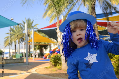 A positive boy in a brilliant clown wig and a funny hat, a crown. The child celebrates Purim, Halloween, Birthday, Vacation. Merry carnival, masquerade, going to the circus.