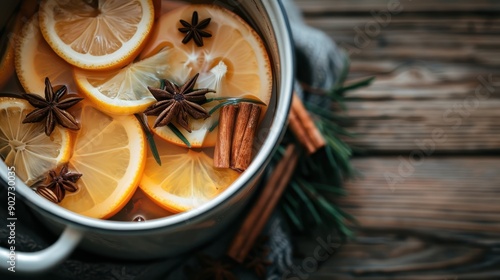 A pot filled with slices of citrus fruits, star anise, and cinnamon sticks, creating a tantalizing and visually appealing concoction, perfect for a cozy setting.