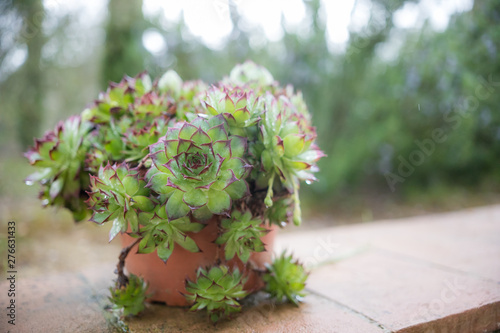 A pot with green lace flowers is on the table in the outdoor