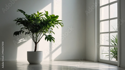 A potted plant stands in the corner of the room. Located in a minimalist white room bathed in soft sunlight streaming through the large scansinavia windows.