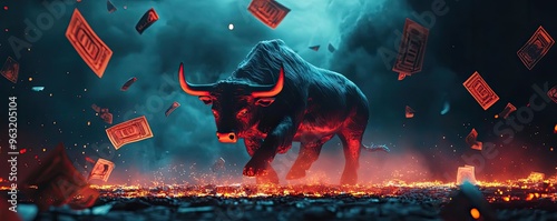 bull, strength, finance, powerful, symbolize, determination, dynamic, financial, environment, charge, surge, success, money, nature, thunder, abstract, dream, background, red, stunning, challenge, bright, style, harsh, action, art, business, concept, float, swirl, night, glow, value, market, racked, trend, blue, stock, fly, design, neon, scene, triumph, model, progress, vibrant, signs