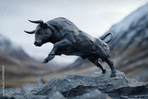 bull, statue, leaping, rock, mountain, landscape, powerful, animal, dark, grey, stone, sculpture, figure, wildlife, nature, outdoors, leap, strong, dramatic, silhouette, metal, art, detail, design, bronze, rocky, background, scenic, view, action, foreground, sharp, focused