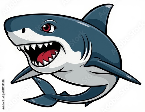 A powerful great white shark bursts forth, jaws agape, revealing razor-sharp teeth and blazing red eyes as it charges forward with a strong, sweeping tail