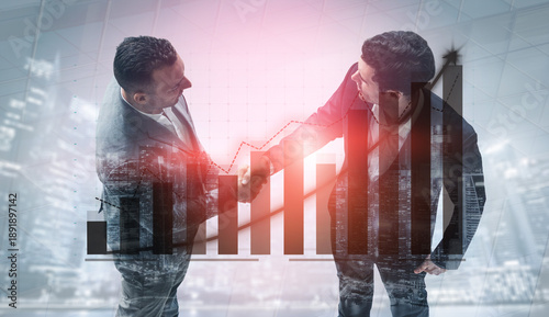 A powerful visual of two business professionals shaking hands, symbolizing a successful partnership, with financial graphs and a city skyline in the background. Impute