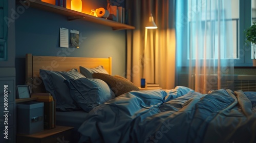 A practical scene of a bed in a student room on campus, featuring simple decor and functional furniture, soft lighting creating a warm and inviting atmosphere