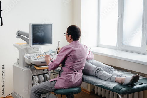 A pregnant girl gets an ultrasound of her abdomen at the clinic. Medical examination