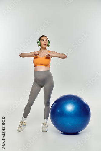 A pregnant woman in activewear stands next to a bright blue exercise ball on a grey background.