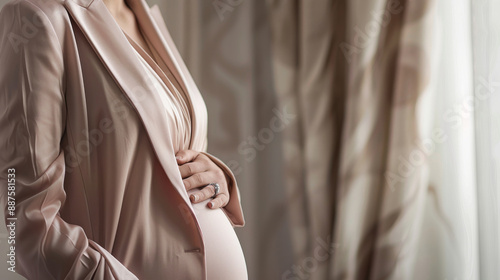A pregnant woman is wearing a beautiful dress and holding her stomach, maternity fashion
