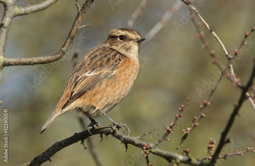 A pretty female Stonechat, Saxicola rubicola, perching on branch of a Blackthorn tree. It is hunting for insects to eat.