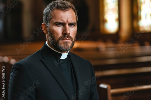 priest, church, religious, clergy, collar, man, face, expression, serious, solemn, sombre, contemplative, spiritual, faith, belief, god, chapels, pew, altar, window, stained, glasses, light, dark, shadow, suit, jacket, attaching, beard, hair, eye, brown, black, white, wood, architecture, worship, prayer, devotion, holy, sacred, christianity, catholic, religion, christian