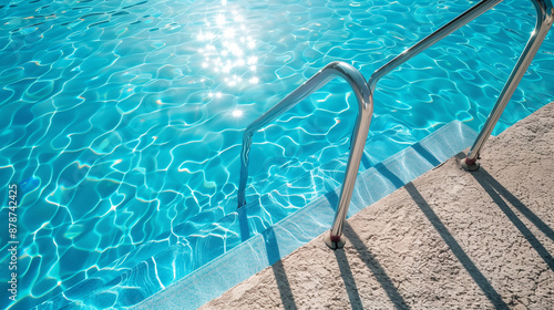 swimming pool, sparkling, sunlight, poolside, ladder, pristine, refreshing, inviting, shimmering, aquatic, summer, relaxation, clean, crystal-clear, vacation, leisure, tranquil, serene, beautiful, natural light, fresh, daylight, clarity, sunlit