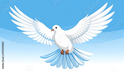 A pristine white dove in flight against a bright blue sky