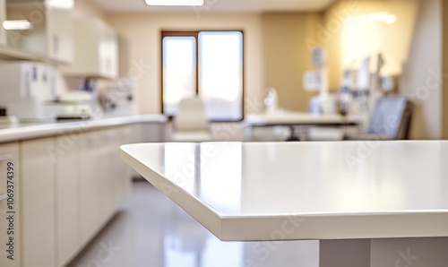 A pristine white tabletop counter sits empty in a hospital clinic, highlighting a tidy environment equipped for medical activities
