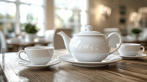 A pristine white teapot and teacups sit on a rustic wooden table in a bright cafe setting.