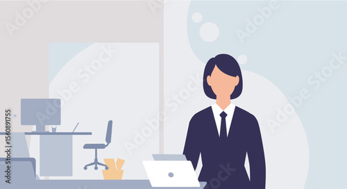 banner, marketing, web design, presentation, infographic, illustration, businesswoman, office, desk, computer, laptop, corporate, professional, work, business, employee, manager, executive, modern, minimalist, vector, graphic, digital, online, cyberspace, website, app, template, layout, design, concept, solution, strategy, success, career, finance, management, technology, communication, global, datum, analysis, workspace, entrepreneurship