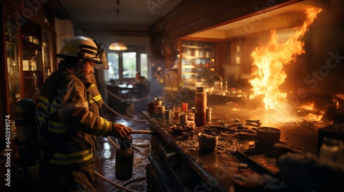 A professional firefighter puts out the flames. A burning house and a man in uniform, view from the back. Concept: Fire engulfed the room, danger of arson