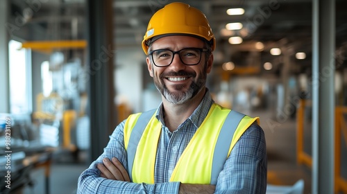 A professional heavy industry engineer posing for a portrait in a workshop