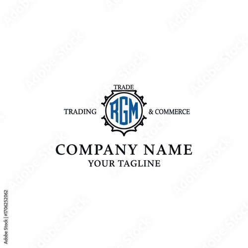A professional logo design featuring a circular gear emblem with blue RGM initials, surrounded by 'TRADE' and 'TRADING & COMMERCE' text, suitable for a business brand.