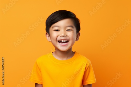 a professional portrait studio photo of a cute asian boy child model with perfect clean teeth laughing and smiling. isolated on orange background. for ads and web design