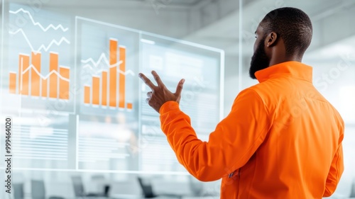 A professional uses interactive technology to analyze data trends in a modern office environment, promoting innovation and collaboration.