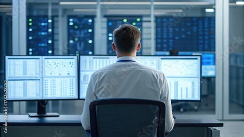 A professional working at multiple monitors, analyzing data in a modern office environment, highlighting technology and focus.