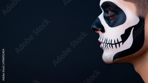 skull, face, paint, profile, art, make-up, design, dark, background, creativity, halloween, portrait, expression, aesthetic, decoration, identity, culture, festive, style, human, character, visual, performance, beauty, fashion, illustration, symbolism, monochrome, side, shadow, artistic, skittish, celebration, transformation, imagery, emotion, tradition, craft, personality, contrast, detail, skull, dramatic, elegance, uniqueness, representation, fantasy, horror, expressionism