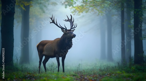 A proud stag standing in a misty forest clearing at dawn