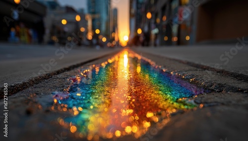 A puddle reflecting a rainbow on a city street at sunset. Urban scene with blurred figures and cityscapes in the background, with a focus on the colorful puddle